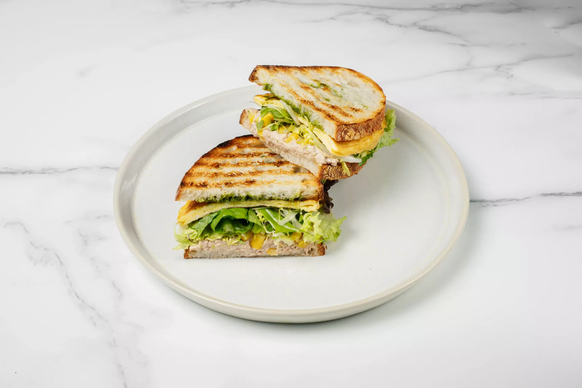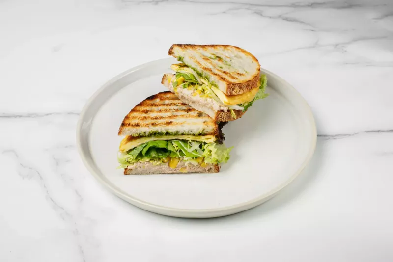 - Сэндвич с консервированным тунцом, кукурузой, листьями салата и соусом песто