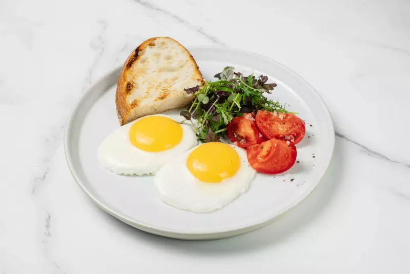 - Глазунья из двух яиц с хрустящим тостом, томатами и листьями салата