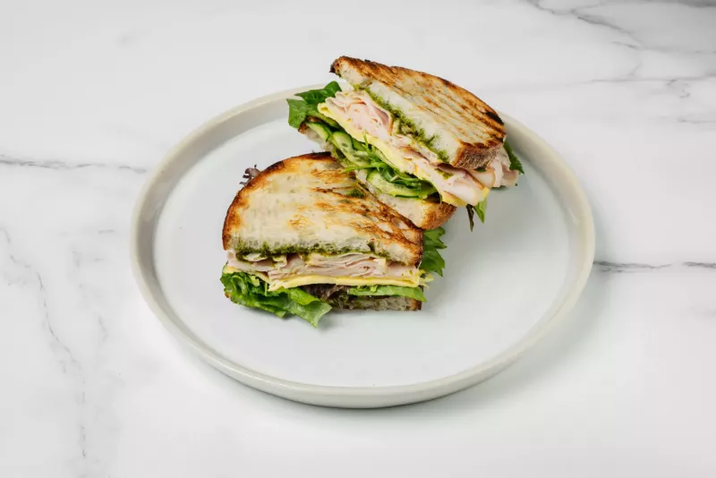 - Сэндвич с куриной грудкой, соусом песто, яйцом и листьями салата