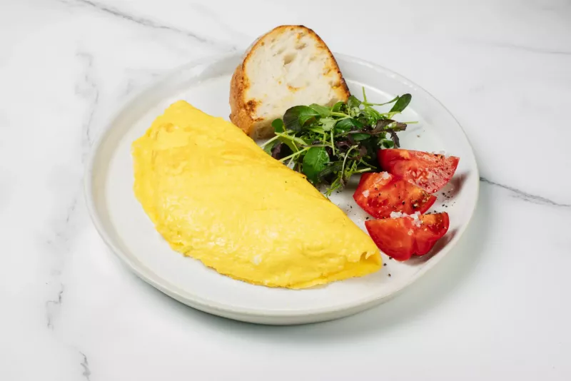 - Белковый омлет с хрустящим тостом, томатами и листьями салата