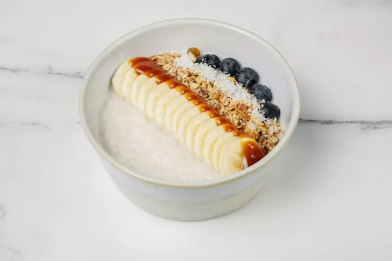 - Рисовая каша на кокосовом молоке с бананом и карамелью