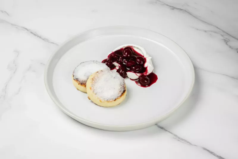 - Нежные сырники из творога и сливочного сыра с домашним вареньем из вишни